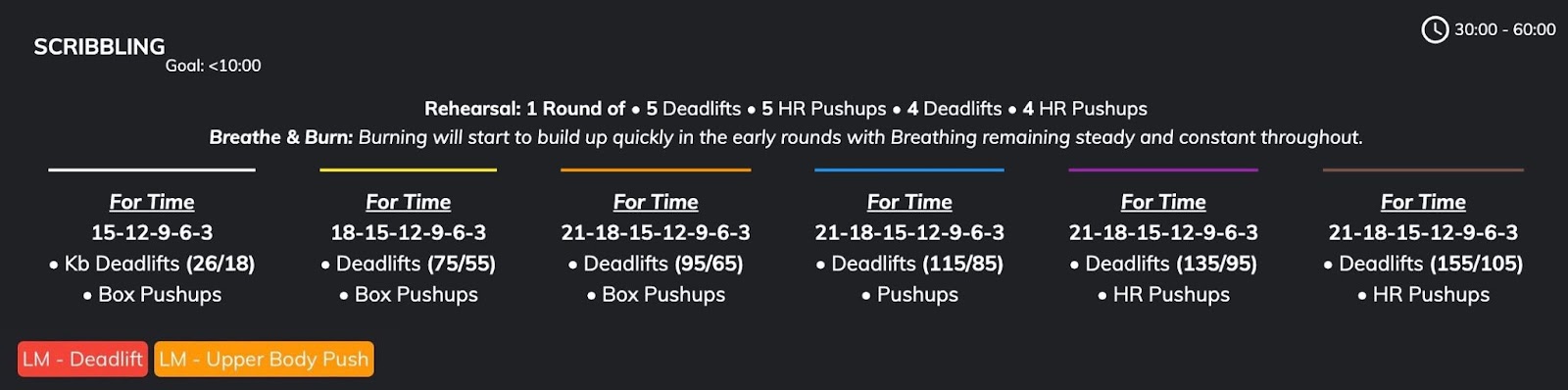 An example of a workout showing Levels Consideration (displayed in ChalkitPro) A female client with the overall level of BLUE comes in with a strength in Deadlift (RED) but a weakness in UB Push (ORANGE), based on her Levels (indicated in the bottom left in image). We refer to the day’s workout for appropriate adjustments around safety & consistency, and we scale it down to an ORANGE UB Push level — in this case, to Box Pushups. But for Deadlifts we can bump it up to a higher weight, in this case bumping her to 105lbs, because she has proven competence at this level and above — this allows an appropriate Deadlift weight, that matches our intention for the workout and produces a challenging workout that produces results.